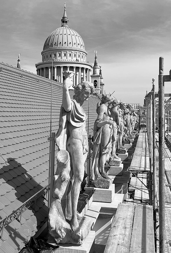 Unser Projekt in der Potsdamer Mitte nähert sich der Fertigstellung. Heute, am Samstagmittag wurden die letzten Teile der Rüstung auf der Westseite des früheren Plögerschen Gasthofs abgebaut. Erstmals ist ein größerer Teil der rekonstruierten Hildebrandschen Fassade zu sehen. Schön das Ensemble mit Landtag und Sepp Webers ehemaligen Interhotel im Hintergrund. Interessant wird bald auch der Vergleich der Westseite -ohne Attikafiguren- mit der Südseite -mit Figuren- sein. Palladios Vorbild in Vicenza zeigt ja keine Figuren…